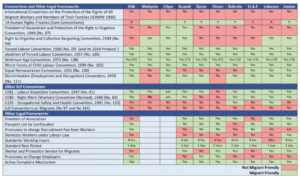 The following chart outlines the regulatory frameworks governing the working conditions in some of the most common destination countries for Bangladeshi labour migrants. It shows the migrant friendliness of the regulatory approach that these country takes. This chart can be useful for prospective migrants when deciding where they want to pursue employment, and also to labour migration policymakers and stakeholders, who can refer to it in their approach to migration governance and advocacy.