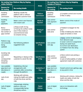 In both cases, drivers are demotivated to follow the platform way for many reasons affecting their income from, and flexibility to work with, the platforms. Table 1 (below) points out a few areas of friction that are motivating the riders to de-route from the platform way.