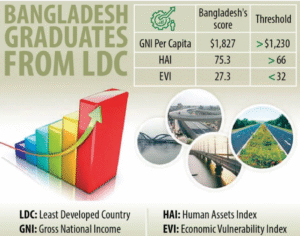Bangladesh is poised to transition from its status as a Least Developed Country (LDC) in November 2026. Having been included in this classification for a period of 46 years, the country has satisfied all three criteria which are evaluated triennially by the Committee for Development Policy (CDP) of the United Nations, for the second time in February 2021, and has received the conclusive recommendation to graduate. During its 76th session, the United Nations General Assembly (UNGA) passed the resolution concerning Bangladesh’s graduation from the category of Least Developed Countries (LDCs). In the year 2018, Bangladesh successfully met all three criteria required for graduation, signifying a remarkable achievement. These criteria, including the Gross National Income (GNI), Human Assets Index (HAI), and Economic and Environmental Vulnerability Index (EVI), are crucial indicators of a country’s per capita income levels, human assets, and ability to cope with economic and environmental challenges. By meeting these benchmarks, a country’s capability to continue on the path of progress and its corresponding assistance requirements are evaluated. Bangladesh has exhibited exceptional performance across all three indexes, surpassing expectations as only two are necessary for a recommendation in graduating LDC status (Sarwar, 2021). This accomplishment not only demonstrates the country’s economic strength over a sustained period but also its resilience in times of crisis, such as the COVID-19 pandemic (Wing, 2023).